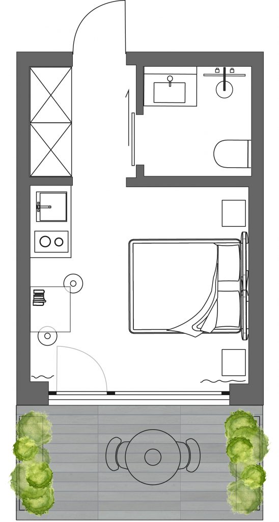 Das Design Apartment bietet auf 24 m² eine perfekte Kombination aus Stil und Funktionalität.
